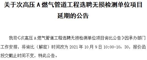 关于次高压A燃气管道工程选聘无损检测单位项目延期的公告