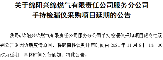 关于绵阳兴绵燃气有限责任公司服务分公司手持检漏仪采购项目延期的公告