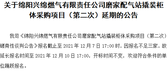 关于绵阳兴绵燃气有限责任公司磨家配气站撬装柜体采购项目(第二次)延期的公告