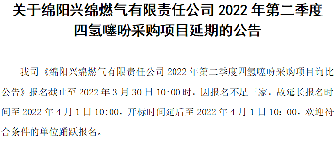 关于绵阳兴绵燃气有限责任公司2022年第二季度四氢噻吩采购项目延期的公告