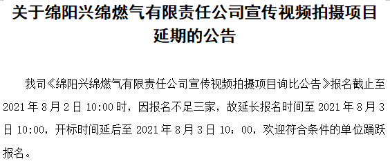 关于绵阳兴绵燃气有限责任公司宣传视频拍摄项目延期的公告