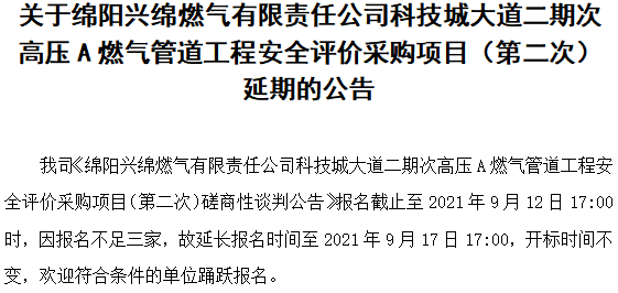 关于绵阳兴绵燃气有限责任公司科技城大道二期次高压A燃气管道工程安全评价采购项目(第二次)延期的公告