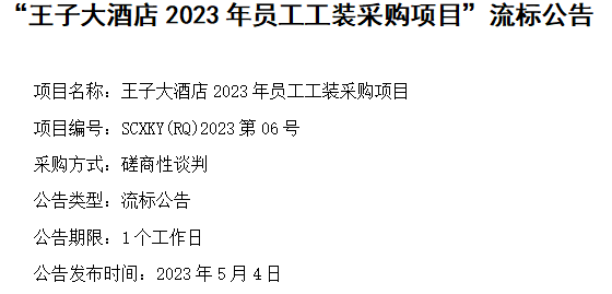 “王子大酒店2023年员工工装采购项目”流标公告