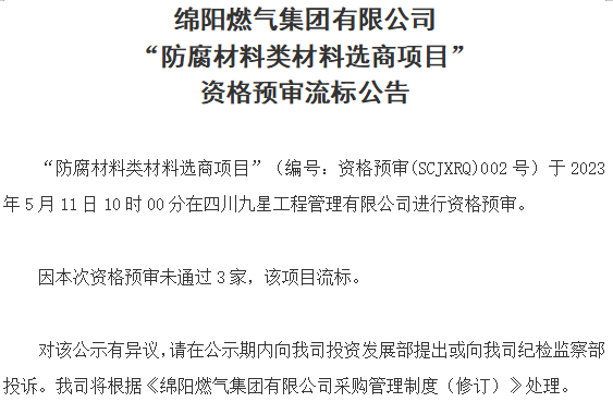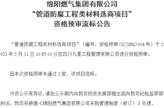 “管道防腐工程类材料选商项目”(编号:资格预审(SCJXRQ)004号)于2023年5月11日10时00分在四川九星工程管理有限公司进行资格预审。因本次资格预审未通过3家,该项目流标。