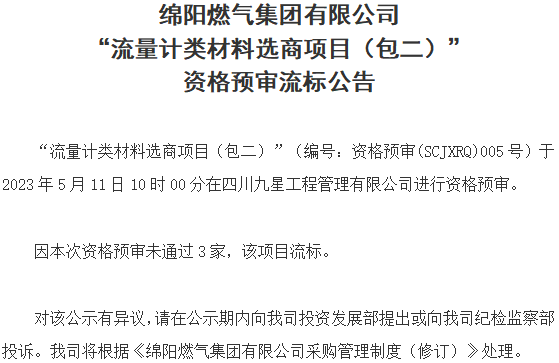 “流量计类材料选商项目(包二)”(编号:资格预审(SCJXRQ)005号)于2023年5月11日10时00分在四川九星工程管理有限公司进行资格预审。因本次资格预审未通过3家,该项目流标。