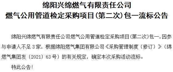 绵阳兴绵燃气有限责任公司燃气公用管道检定采购项目(第二次)包一,因参与申请人不足3家,根据绵阳燃气集团有限公司《采购管理制度(修订)》(绵燃气集团发〔2021〕63号)的有关规定,确定本次采购活动流标。