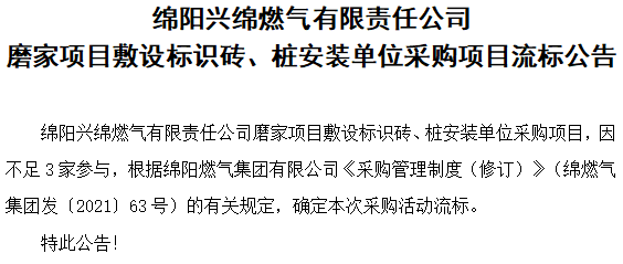 绵阳兴绵燃气有限责任公司磨家项目敷设标识砖、桩安装单位采购项目,因不足3家参与,根据绵阳燃气集团有限公司《采购管理制度(修订)》(绵燃气集团发〔2021〕63号)的有关规定,确定本次采购活动流标。