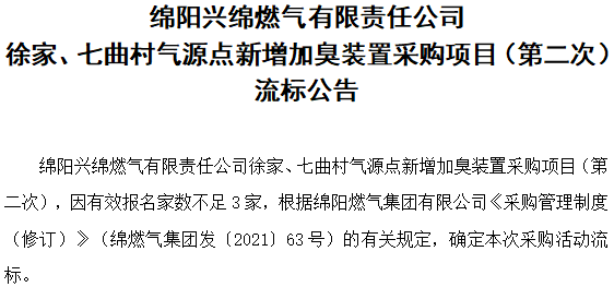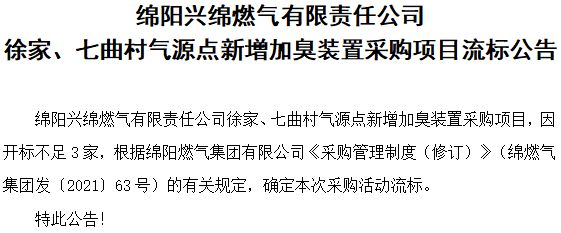 绵阳兴绵燃气有限责任公司徐家、七曲村气源点新增加臭装置采购项目(第二次),因有效报名家数不足3家,根据绵阳燃气集团有限公司《采购管理制度(修订)》(绵燃气集团发〔2021〕63号)的有关规定,确定本次采购活动流标。
