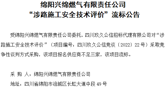 受绵阳兴绵燃气有限责任公司委托,四川玖久公信招标代理有限公司对“涉路施工安全技术评价”(项目编号:四川玖久公信竞谈〔2022〕22号)采取竞争性谈判方式采购,该项目报名供应商不足三家,该项目流标。
