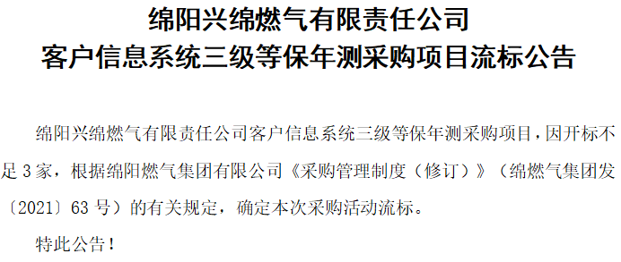 绵阳兴绵燃气有限责任公司客户信息系统三级等保年测采购项目,因开标不足3家,根据绵阳燃气集团有限公司《采购管理制度(修订)》(绵燃气集团发〔2021〕63号)的有关规定,确定本次采购活动流标。