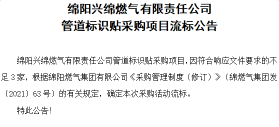 绵阳兴绵燃气有限责任公司管道标识贴采购项目,因符合响应文件要求的不足3家,根据绵阳燃气集团有限公司《采购管理制度(修订)》(绵燃气集团发〔2021〕63号)的有关规定,确定本次采购活动流标。