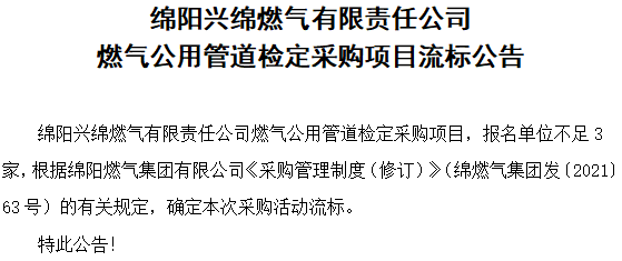绵阳兴绵燃气有限责任公司燃气公用管道检定采购项目,报名单位不足3家,根据绵阳燃气集团有限公司《采购管理制度(修订)》(绵燃气集团发〔2021〕63号)的有关规定,确定本次采购活动流标。