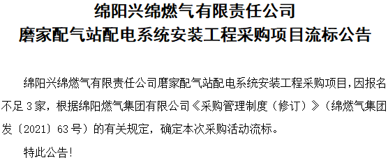 绵阳兴绵燃气有限责任公司磨家配气站配电系统安装工程采购项目,因报名不足3家,根据绵阳燃气集团有限公司《采购管理制度(修订)》(绵燃气集团发〔2021〕63号)的有关规定,确定本次采购活动流标。