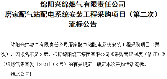 绵阳兴绵燃气有限责任公司磨家配气站配电系统安装工程采购项目(第二次),因报名不足3家,根据绵阳燃气集团有限公司《采购管理制度(修订)》(绵燃气集团发〔2021〕63号)的有关规定,确定本次采购活动流标。