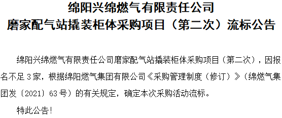 磨家配气站撬装柜体采购项目(第二次)流标公告