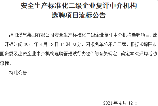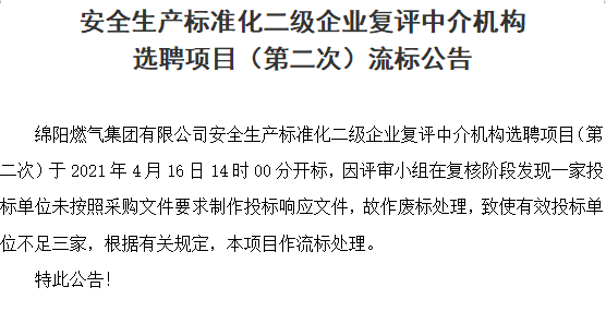 安全生产标准化二级企业复评中介机构选聘项目流标公告