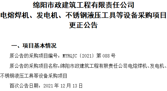 电熔焊机、发电机、不锈钢液压工具等设备采购项目更正公告