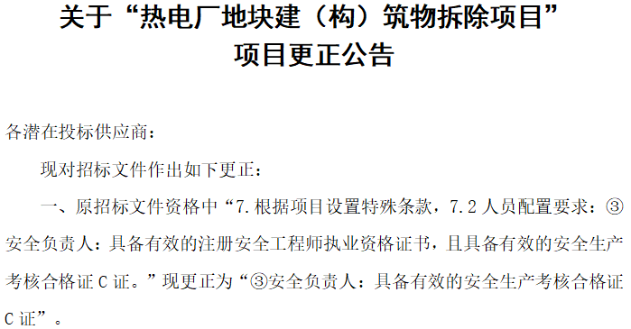 关于“热电厂地块建(构)筑物拆除项目” 项目更正公告