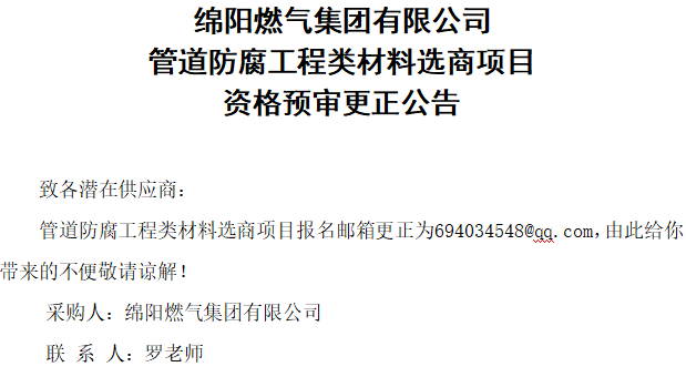 致各潜在供应商:管道防腐工程类材料选商项目报名邮箱更正为694034548@qq.com,由此给你带来的不便敬请谅解!