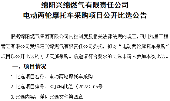 根据绵阳燃气集团有限公司内控制度及相关法律法规的规定,四川九星工程管理有限公司受绵阳兴绵燃气有限责任公司委托,拟对“电动两轮摩托车采购”项目以公开比选的方式实施采购。兹邀请符合要求的比选申请人参加本次比选。